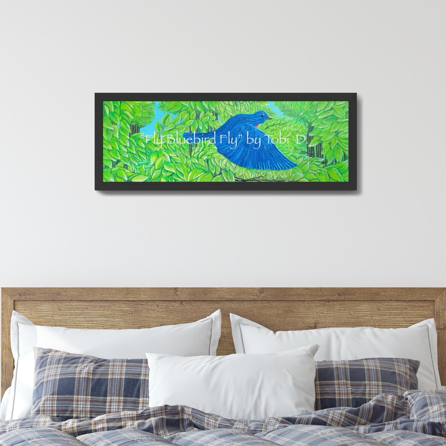 After procrastinating in many ways, I was able to capture a great image of my original acrylic, “Fly Bluebird Fly”. I was able to lovingly place this painting in the warm sunshine on a February day and snap a high quality image. As I lined up the camera I was taken back to the weekend that it was rendered during a few stormy days in 2022.